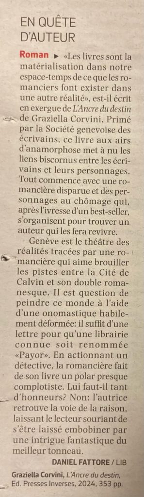 - Prix « La Plume d’Or » 2022 du roman remis par la Société Genevoise des Écrivains